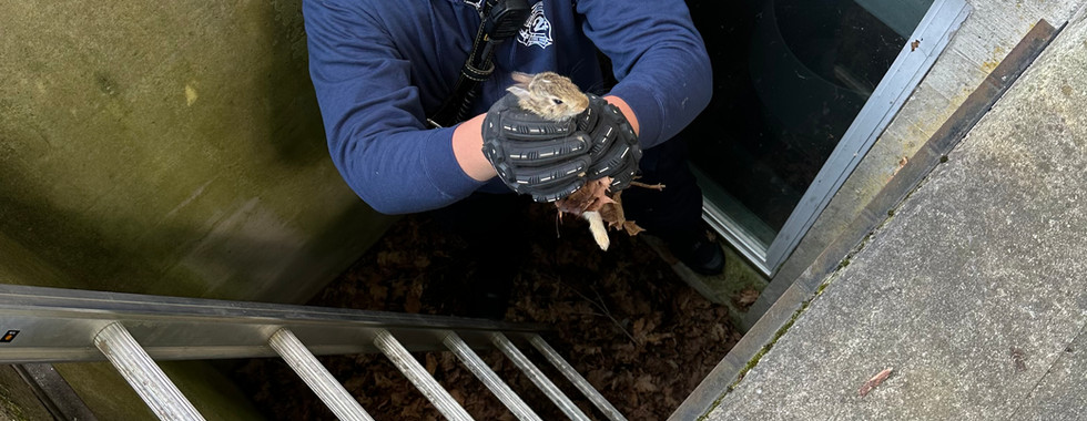 On 8/27/2023 at 13:11 CHFD was dispatched for a trapped bunny. 203, 261, and 263 responded. Arriving units found this guy had fallen into a window well. FF Walsh rapidly removed the grate, deployed a roof ladder into the hole and bravely climbed down. He was able to safely and quickly rescue the trapped baby rabbit and bring them back to the ground level. All CHFD units then returned in service.